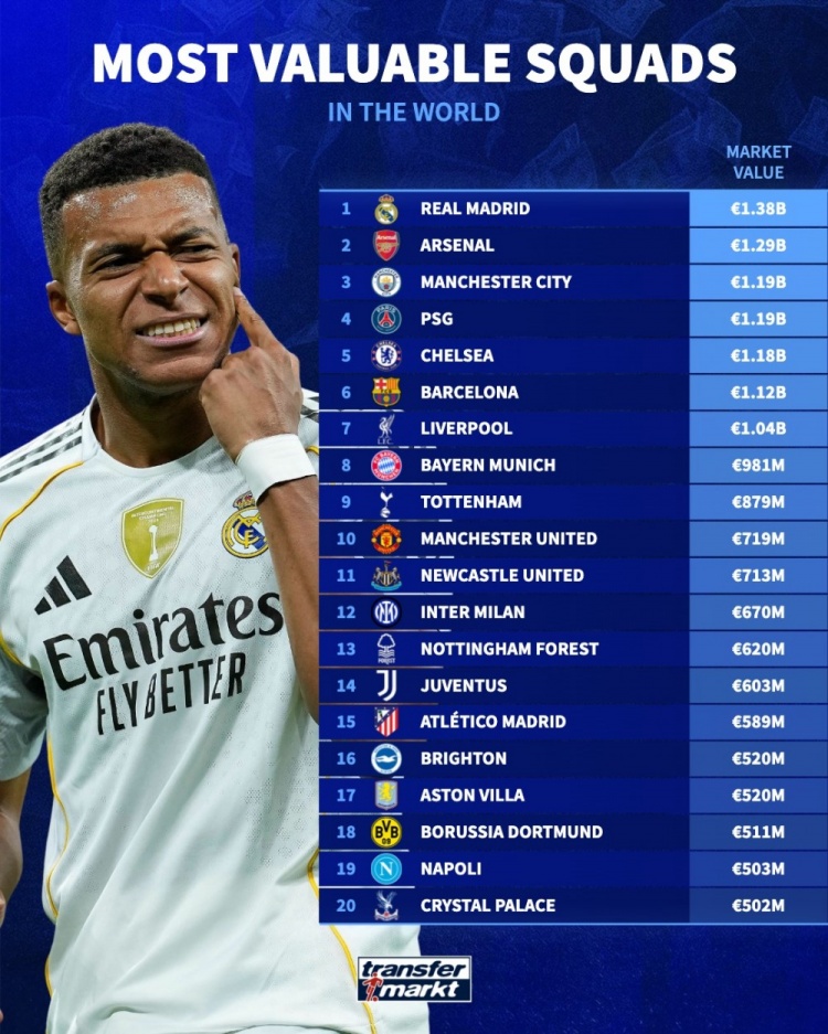 阿森纳和曼城紧随其后,分别以12.9亿欧元和11.9亿欧元的身价排名第二和第三,就好像是在争论谁的明星更闪亮一样。阿森纳,这支历史悠久的球队,总算是在资金上有所突破,看来他们的转会市场连续“肥沃”的耕耘终于见了效果。