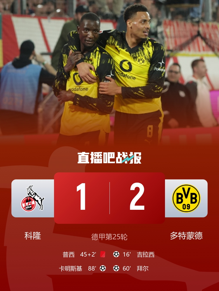 3月8日讯 北京时间凌晨1时30分,2025-26赛季德甲第25轮在莱茵能源体育场展开了一场激动人心的对决,多特蒙德客场挑战科隆。在这场比赛中,上半场吉拉西率先打入一球,拜尔在此进程中贡献了助攻并制造了对方的红牌。进入下半场,拜尔再次破门,而布兰特则为他送上了助攻。不久后,卡明斯基为科隆扳回一城。最终,多特蒙德以2比1击败了少一人的科隆,终结了各项赛事的三场不胜,积累了55分,依然位于积分榜的第二名,距离榜首的拜仁有11分的差距。