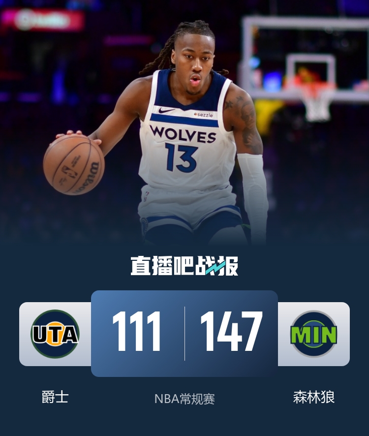 森林狼三位球员得分超过20助力爵士遭遇四连败 戈贝尔贡献21分12篮板 道苏姆斩获23分9助攻 华子因伤缺席_NBA直播