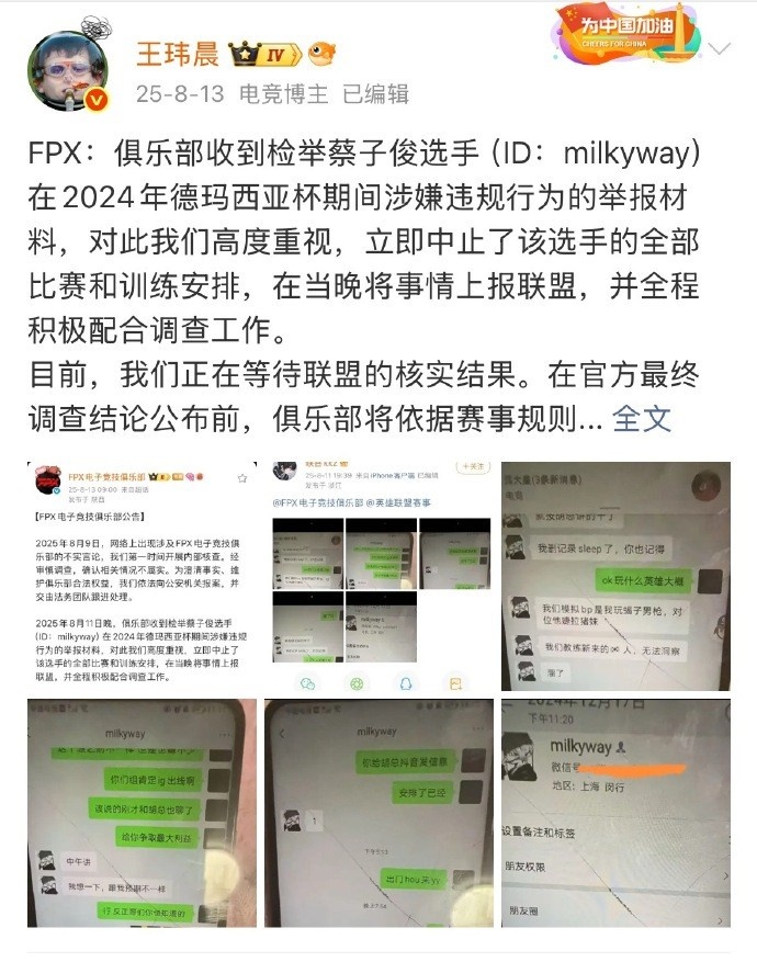 在微博上,媒体人王玮晨分享了关于Milkyway事件的时间线,整理了事情的经过。去年8月13日,FPX战队发布公告,表示接到了对Milkyway的举报,因此决定暂停他的比赛和训练。紧接着,Milkyway坚称聊天记录是伪造的,并已向警方报案。