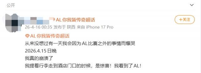 这位粉丝自称不是追星女,甚至好几次提到工作多忙,花一路数千元来看比赛,难道是为了享受一种“名不见经传”的卑微感吗?即使是当红偶像,粉丝偶遇的时候多少也该露出几分热情吧,但当AL掀起心高气傲的姿态,或许他们觉着已经成了不可触碰的高峰。